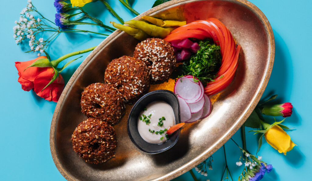 CRISPY FALAFAL, TOMATO, AND CUCUMBER WRAPPED IN LEBANESE BREAD
