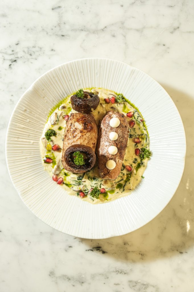 CINNAMON & POMEGRANATE ROASTED CHICKEN WITH MUSHROOM SPINACH SAUCE