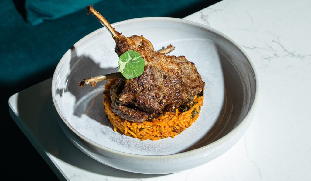 SUCCULENT GRILLED LAMB CHOPS SERVED WITH AUBERGINE RICE & LAMB SAUCE
