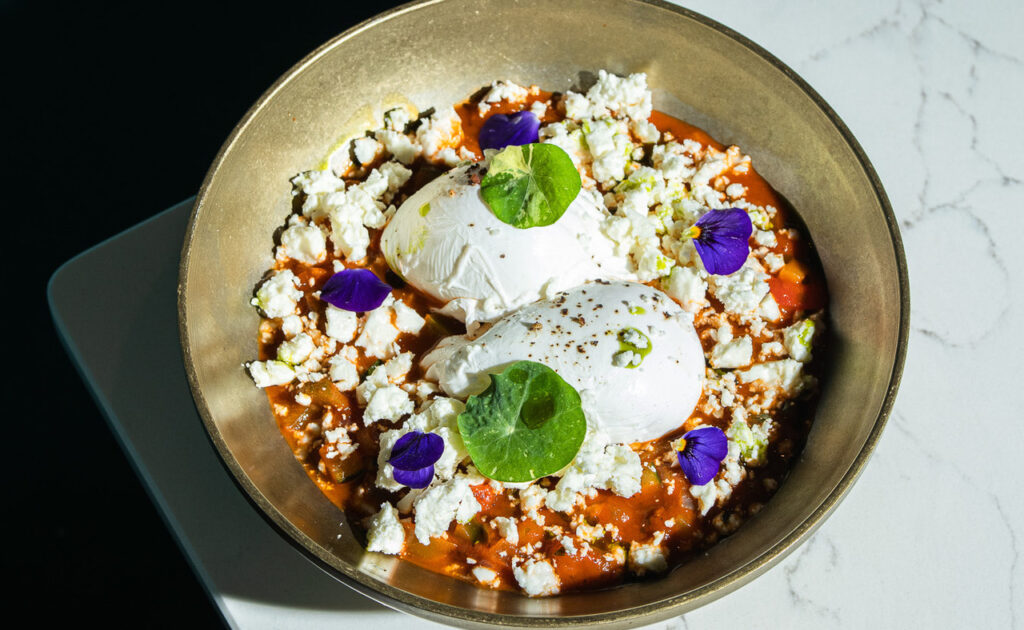 POACHED EGGS COOKED IN SPICED TOMATO & PEPPER SAUCE, SERVED WITH FETA CHEESE & BREAD